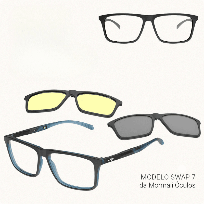 O modelo SWAP7 traz a tendência clip-on, entregando dois óculos em um, com lentes intercambiáveis que ampliam as possibilidades de uso no dia a dia.